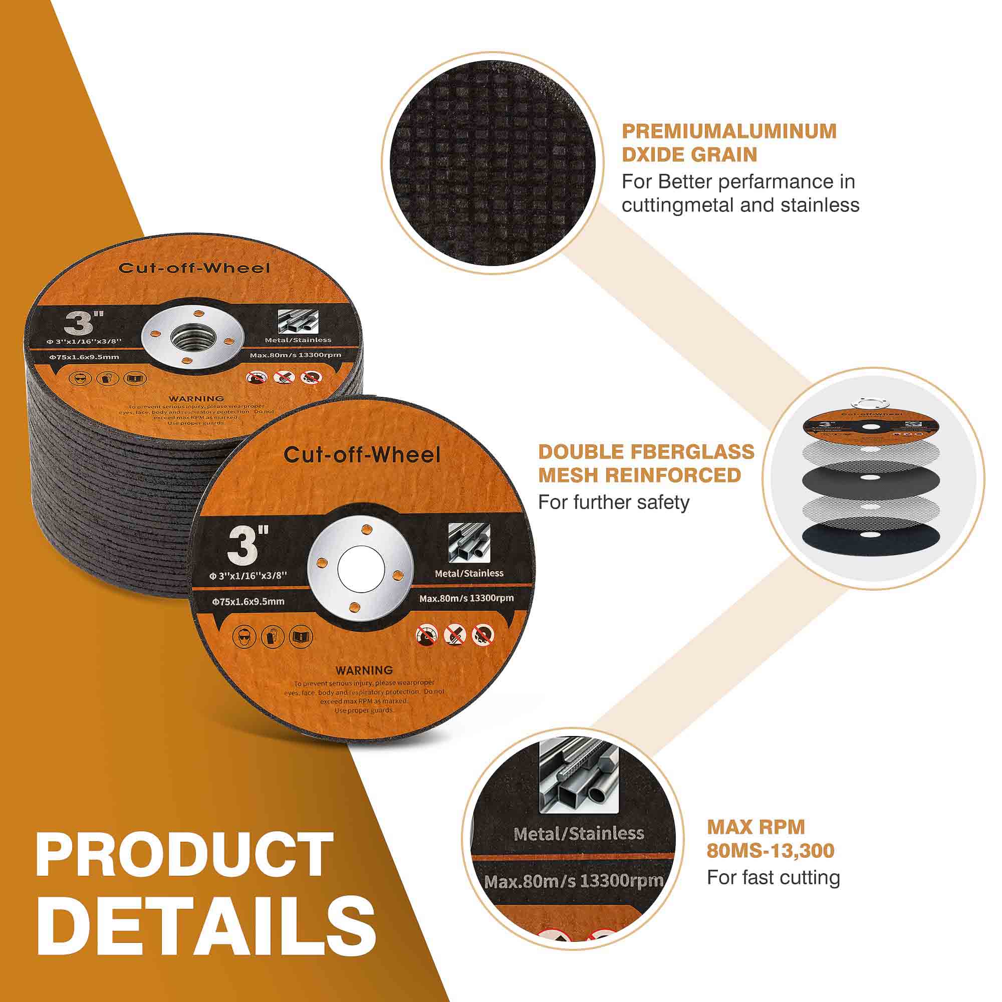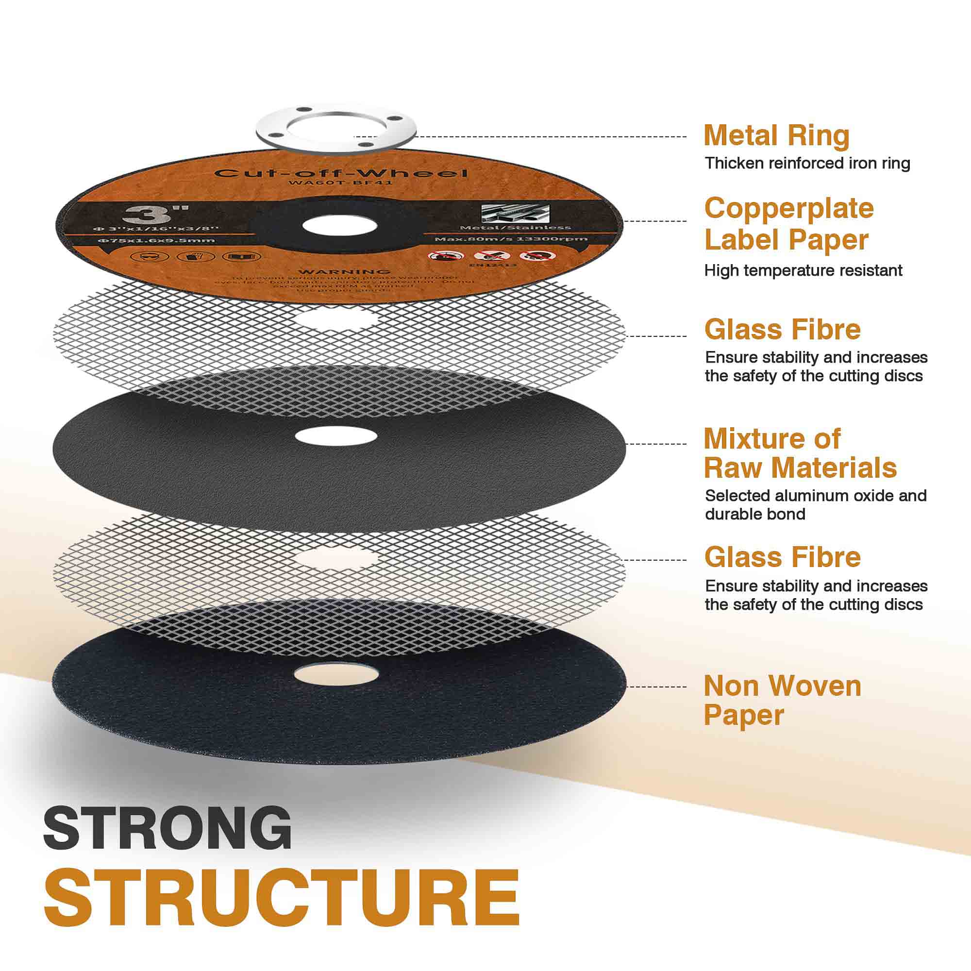 De kern van de dubbele laag glasvezelgaas biedt: 360 ° traanweerstand tijdens de werking met een hoge RPM, explosiebeveiliging onder zware belastingen, trillingsdemping voor soepelere sneden, structurele integriteit, zelfs bij maximale bedrijfssnelheden.
